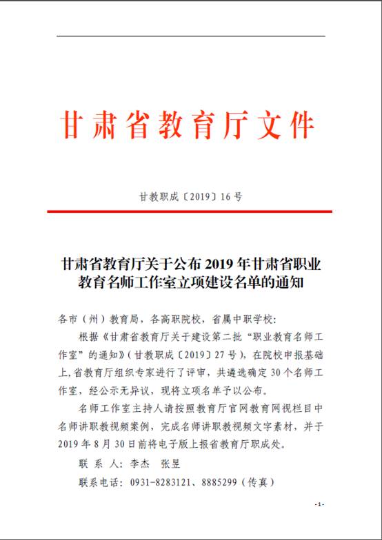 2019年8月,根据《甘肃省教育厅关于建设第二批“职业教育名师工作室”的通知》(甘教职成【2019】27号),经认真总结教学经验成果的基础上,电气工程学院主导申报了2个“名师工作室”。经省教育厅组织专家进行评审,授予电气自动化专业“坚葆林名师工作室”和应用电子技术 “姜毅龙名师工作室”。