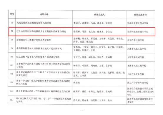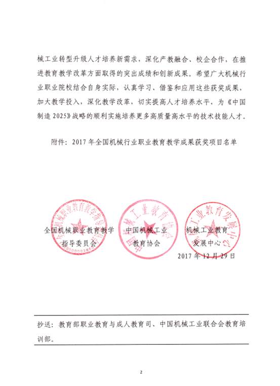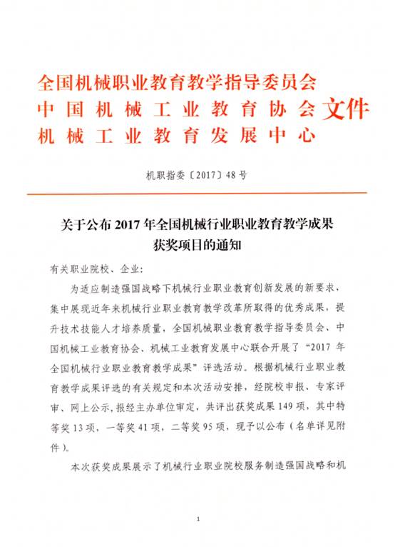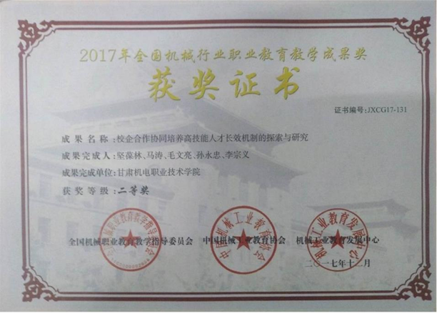 2017年全国机械行业职业教育教学成果奖评选中,我校2项教学成果喜获此项教学成果奖。其中坚葆林教授申报的教学成果《校企合作协同培养高技能人才长效机制的探索与研究》获得二等奖。