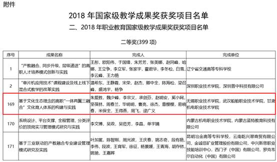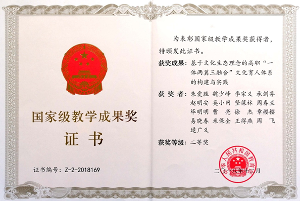 2018年12月,由无锡职业技术学院、武汉船舶职业技术学院、甘肃机电职业技术学院联合申报的国家级教学成果项目《基于文化生态理念的“一体两翼三融合”文化育人体系的构建与实践》,荣获2018年国家级职业教育教学成果奖二等奖。