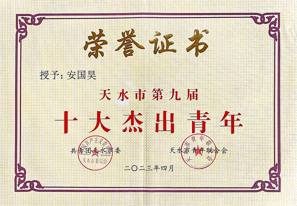 天水市第九届“十大杰出青年”“十大优秀青年”评选活动,由共青团天水市委、天水市青年联合会联合举办。经市直有关单位、行业系统及各团县区委、直属团委推荐,组委会办公室对推荐人选进行审核把关、实地考察、网络投票、评委会评选等程序,评选出了天水市第九届“十大杰出青年”、“十大优秀青年”和“十大杰出青年”提名奖人选。电气工程学院青年教师安国昊,凭借突出的工作业绩和精湛的技艺技能,荣获天水市第九届“十大杰出青年”荣誉称号。