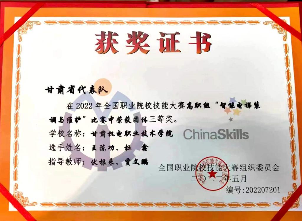 8月21日,从山东省潍坊市闭幕的2022年全国职业院校技能大赛高职组“智能电梯装调与维护”赛项现场传来喜讯,由电气工程学院伏根来、贾文鹏老师指导,王陈功、杜鑫两位同学组成的国赛参赛团队发挥出色,最终在全国27个省市的51支参赛队伍中脱颖而出,荣获团体三等奖。