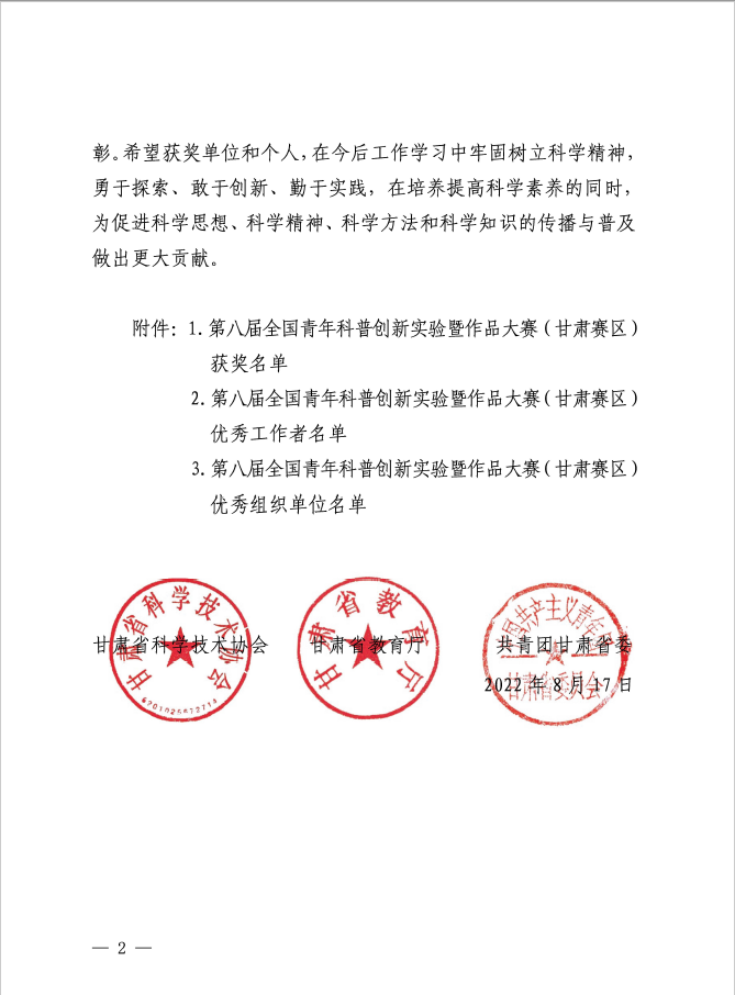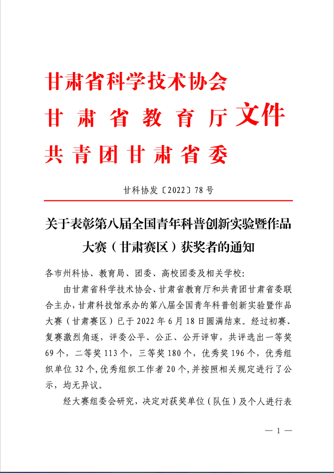 全国青年科普创新实验暨作品大赛(简称“科普创新大赛”)作为一项面向青年学生的全国性科普赛事,旨在进一步贯彻落实《中华人民共和国科学技术普及法》、深入实施《全民科学素质行动计划纲要实施方案(2021-2035年)》,动员和激励广大青年学生参与科普创作和实践,促进科学思想、科学精神、科学方法和科学知识的传播和普及,提高广大青年学生的创新创造能力。2022年6月11日至18日,由甘肃省科协、甘肃省教育厅、共青团甘肃省委联合主办的第八届全国青年科普创新实验暨作品大赛(甘肃赛区)复赛活动在甘肃科技馆举行。