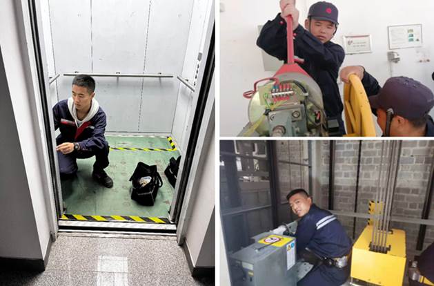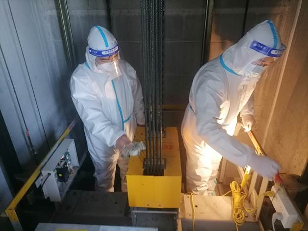 日立电梯班同学余丽强和同事在社区进行电梯维保,助力疫情防控