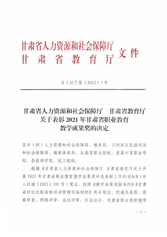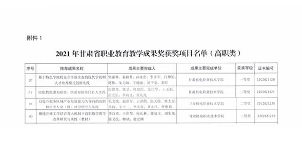 近日甘肃省人力资源和社会保障厅,甘肃省教育厅公布了2021年甘肃省职业教育教学成果奖获奖项目名单,对120个获奖成果项目予以表彰,其中包一等奖50项(高职40项,中职10项)、二等奖70项(高职55项,中职15项)。我校坚葆林教授主持完成、电气工程学院牵头申报的《基于特色学院校企合作新生态的现代学徒制人才培养模式创新实践》,被评为甘肃省职业教育教学成果奖一等奖。此外,我校张德龙教授主持申报的《以职教集团为纽带 供需对接协同育人实践》、李自勇教授主持申报的《德技并修工学结合育人机制下高职数学教学改革研究与实践(附教材)》、毛文亮副教授主持申报的《以提升服务区域产业发展能力为导向的高职“机电类”专业(群)建设研究与实践》等三项成果荣获二等奖。