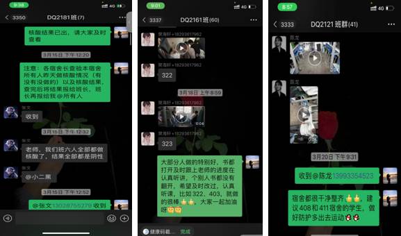 此外,严抓学生网课出勤情况,每天每门课认真统计出勤情况,未按时上课的学生均一一反馈原因,一系列的温暖嘱咐让同学们感受到了来自学校和老师的关怀。