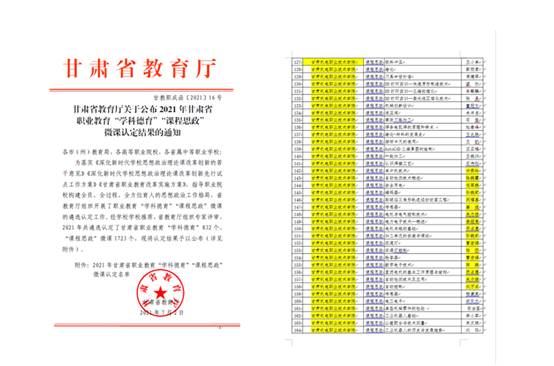 学校115个“课程思政”项目获批2021 年甘肃省职业教育“学科德育”“课程思政”微课认定,其中电气工程学院获批17个项目,在全校10个教学单位中占比15%。