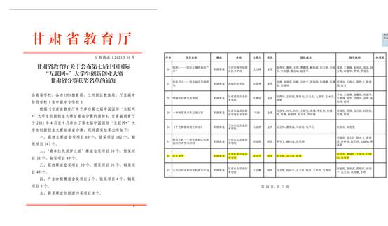 第七届中国国际“互联网+”大学生创新创业大赛甘肃省分赛上获银奖1项。
