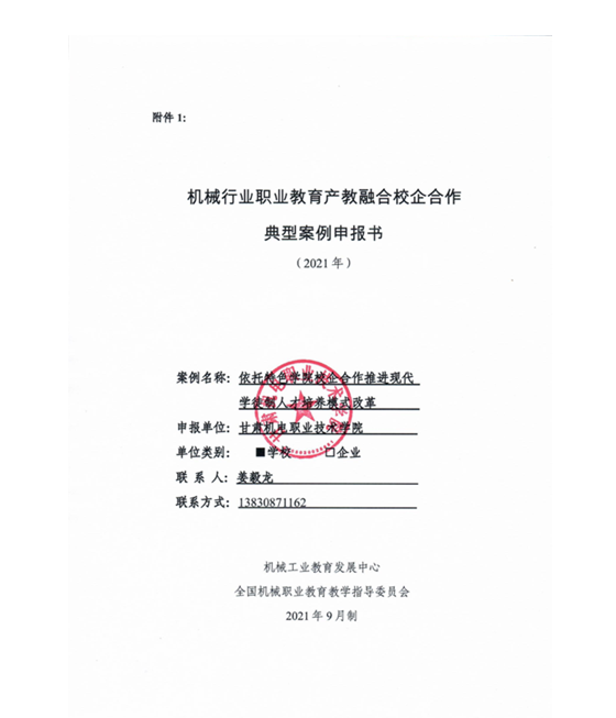 完成全国机械行业职业教育校企合作典型案例——“依托特色学院校企合作推进现代学徒制人才培养模式改革”申报。