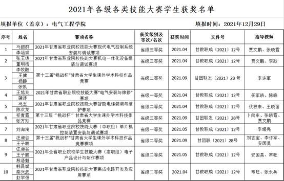 2021年,电气工程学院完成了2021年甘肃省职业院校技能大赛5个赛项、天水市职工技能大赛电工赛项和2022年天水市中职技能大赛4个赛项的承办工作。电气工程学院师生参加各级各类技能大赛,24名学生获得省级以上奖励。