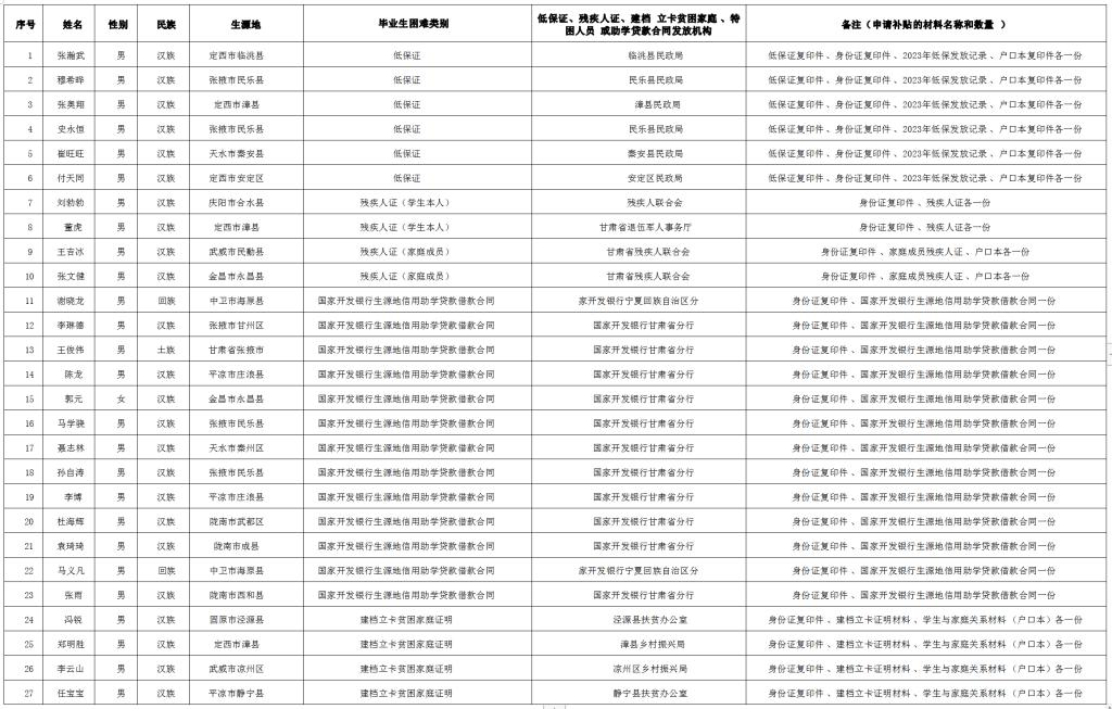 根据《甘肃省人力资源和社会保障厅 甘肃省教育厅 甘肃省财政厅关于做好2024届困难家庭毕业生求职创业补贴审核发放工作的通知》(甘人社通[2023] 387号),电气工程学院严格按照就业补助资金管理使用相关规定,认真组织开展了2024届困难毕业生求职创业补贴申报工作。经学生本人申请、班级(班主任)评议、学院初审,拟同意52名学生申请2024年困难毕业生求职创业补贴,现予以公示。公示期间,如对初审结果有异议,可向电气工程学院联系反馈。