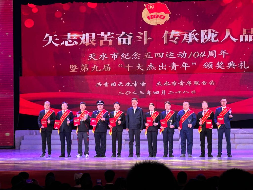2023年4月28日上午,天水市第九届“十大杰出青年”表彰会在秦州大剧院举行。天水市四大组织主要领导、分管联系领导出席会议,市直有关部门主要负责人、各县区党委或政府分管联系领导、各县区及市直团委主要负责人、各界青年代表三百余人参加表彰大会。会上,电气工程学院青年教师安国昊,被评为天水市“十大杰出青年”。天水市委书记冯文戈为“十大杰出青年” 获奖者颁奖。