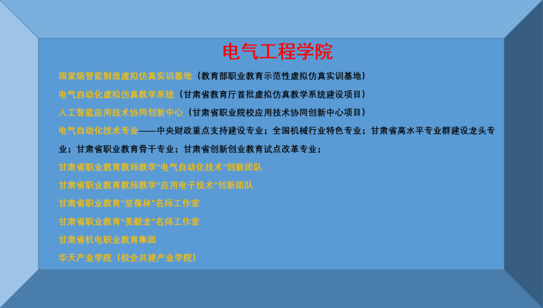 电气工程学院现有教职工52人,其中教授3人,副教授13人;拥有甘肃省职业教育教师教学创新团队2个,团队成员主持完成省级以上科研项目、教学改革项目20余项。建成国家示范虚拟仿真基地1个、甘肃省应用技术协同创新中心 1 个、甘肃省职业教育名师工作室2个、省级示范实训基地 2 个、省级开放型大学生创新工坊1个。目前开设电气自动化技术、电力系统自动化技术、供用电技术、输配电工程技术、电梯工程技术、应用电子技术、集成电路技术等7个专业,其中电气自动化技术专业为省级高水平专业群建设项目龙头专业、甘肃省骨干专业、全国机械行业特色专业、中央财政重点支持建设专业;电梯工程技术为校级特色专业。