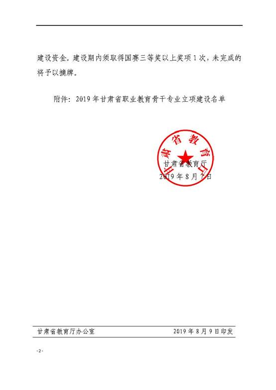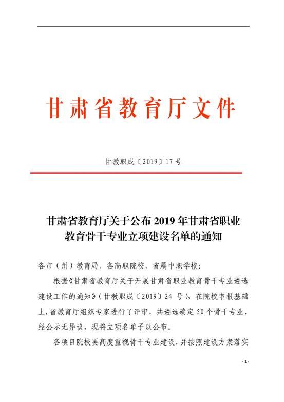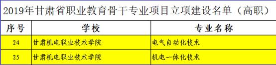 2019年8月,甘肃省教育厅下发《甘肃省教育厅关于公布 2019 年甘肃省职业教育骨干专业立项建设名单的通知》,甘肃机电职业技术学院电气工程学院龙头专业“电气自动化技术”和智能控制学院龙头专业“机电一体化技术”,被认定为甘肃省2019年职业教育骨干专业。