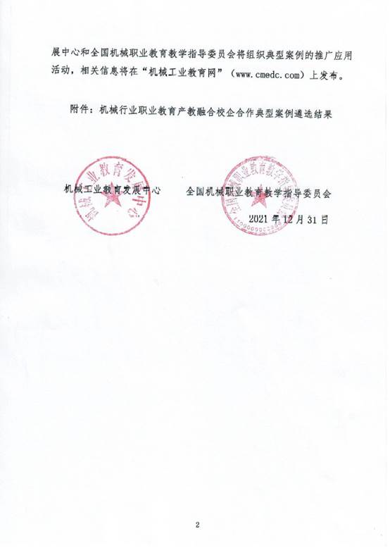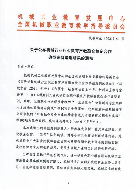 2021年12月,机械行业职业教育产教融合校企合作典型案例遴选结果公布,电气工程学院主导申报的《依托特色学院校企合作推进现代学徒制人才培养模式改革》案例入选优秀案例名单。